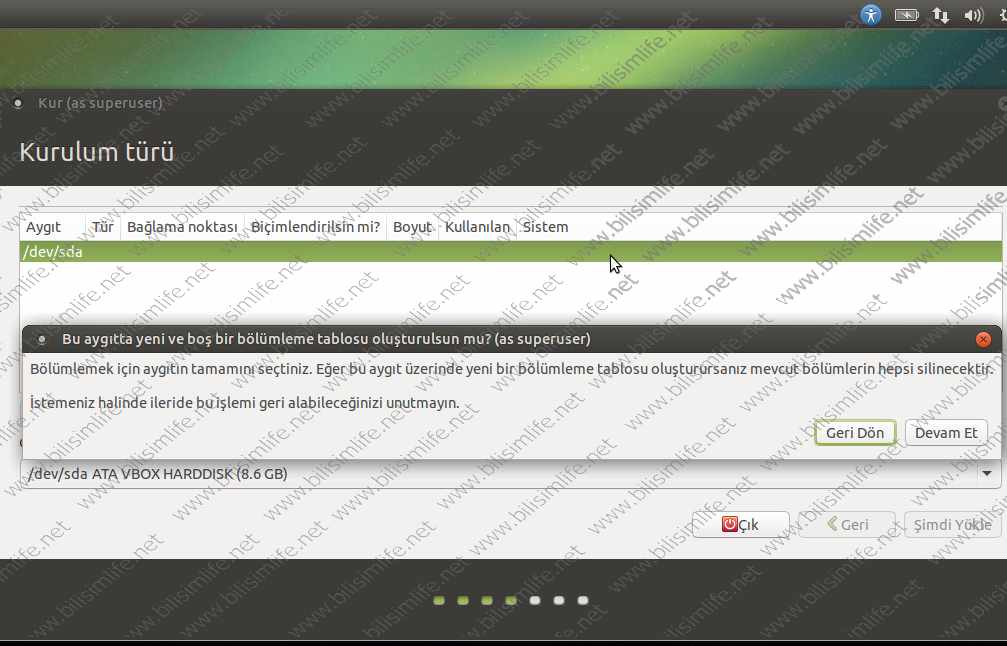 Eğer yeni bir hard disk üzerinde kurulum yapacaksanız önce hard disk tablosu oluşturmalıyız. Ama sizin diskiniz daha önceden zaten bölümlendirilmişse hemen o bölümleri göreceksiniz. Test amaçlı kuruyorsanız bir bölüm görmeyeceksiniz.