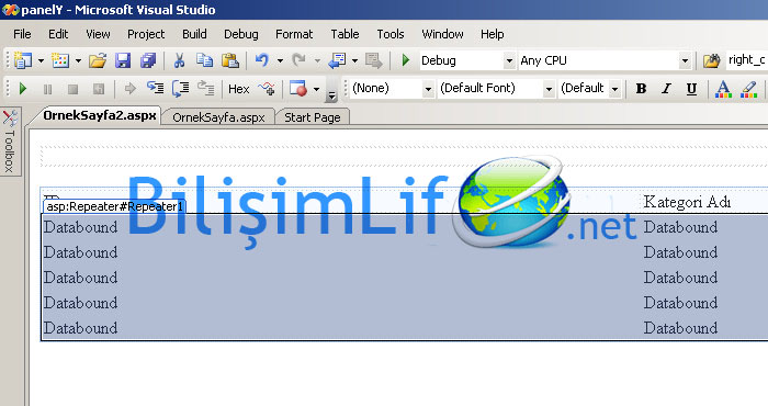 Kodları yazdıktan sonra tasarım kısmına gelelim. Görüldüğü gibi Databound isminde yazılar geldi. Repeater nesnesini başarıyla ekledik.