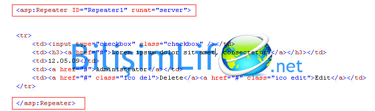 Repeater nesnesi eklenilecektir. Repeater nesnesinin kapanış tagını alın (yani </asp:Repeater> kısmını), <tr> tagının kapanış tagının altına yapıştırın (yani </tr> kısmının altına).
