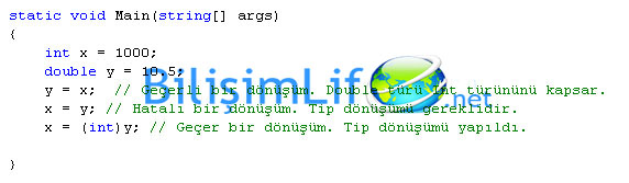 Yukarıdaki x = (int)y; kod satırında tip dönüşümü yapılmış. Y değeri normalde double’dı.