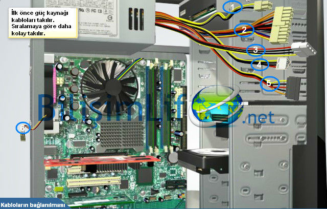 Öncelik güç kaynağın kablolarındadır. Çünkü güç kaynağı anakarta güç vermedikçe hiçbir şey çalışmayacaktır. Bunun için aşağıdaki resimde görülen kabloları numaralandırarak, her bir numaradaki kablonun nasıl ve nereye takılması gerektiğini uygulayalım.