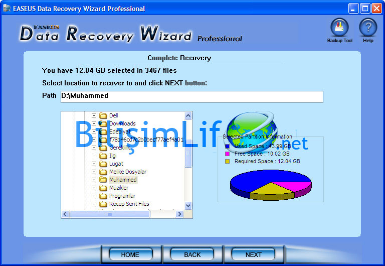 Biz o kadar veriyi bulduk ancak bunları nereye aktaracağız? Işte bu soru için bu pencere karşımıza çıkıyor. Zaten bizlere ne kadar boyutta dosya bulduğunu ve kaç dosya seçtiğini göstermektedir. Ihtiyacımız olan alanı da gösterir.
